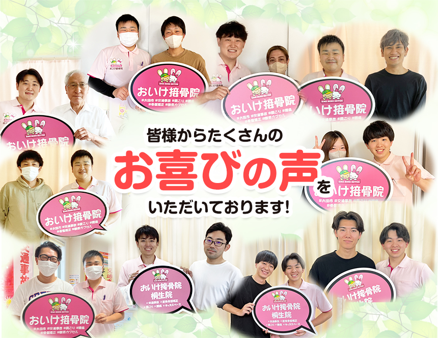 群馬県の太田市や桐生市近くの方で、交通事故などのムチウチや肩こり腰痛、体の痛みや悩みがある方はぜひおいけ接骨院グループをお勧めします。